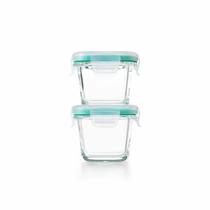 OXO Good Grips Smart Seal Glass Containers offer a safe, easy, attractive solution for fresh food storage. Four locking tabs and a removable silicone gasket form a strong, leakproof seal. The BPA-free borosilicate glass is stain-proof and can withstand extreme temperature changes without cracking. The elegant design looks great in any kitchen or on any dining room table. Smart Seal Containers are dishwasher safe and stack in your fridge or freezer, or nest in your cabinet. Bodies and lids are microwave, freezer and dishwasher safe. This set includes two 4 oz Containers with their leakproof lids, and the small size is great for dips and sauces.