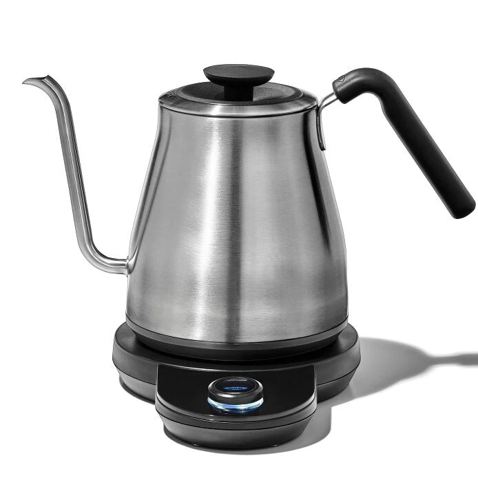 The OXO Brew Adjustable Temperature Pour-Over Kettle lets you take pour-over coffee into your own hands. The handle and body are optimized for effortless balance, and the precise-pour gooseneck spout provides ultimate control. Choose your water temperature and time the process without a separate tool and enjoy your perfect cup of pour over.