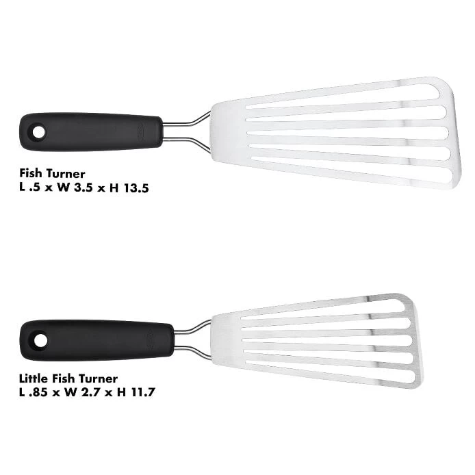 Use this handy Fish Turner when cooking whole fish, seafood cakes and more. The beveled edge slides easily beneath foods and the slots in the head allow grease to drain. The durable, stainless steel head confidently flips whole filets and the soft handle allows for a comfortable grip.
