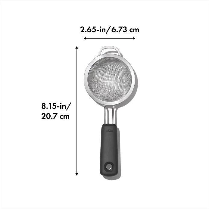 The OXO Good Grips 3-in/7.6 cm Mini Strainer is ideal for straining citrus juice, dusting powdered sugar over sweet treats, steeping loose leaf tea and more. The wide stainless steel rim and balancing loop help secure the Strainer while you work and the double-rod construction stands up over time. The comfortable grip won’t slip, even when wet. Dishwasher safe. Also available in 6-inch and 8-inch sizes.Features Fine mesh for straining citrus juice, dusting powdered sugar, steeping loose leaf tea and other tasks Extra-sturdy stainless steel double rod construction Secure loop keeps Strainer stable on mugs and bowls Handle won’t slip, even when wet Also available in 6-Inch and 8-Inch sizes Dishwasher Safe