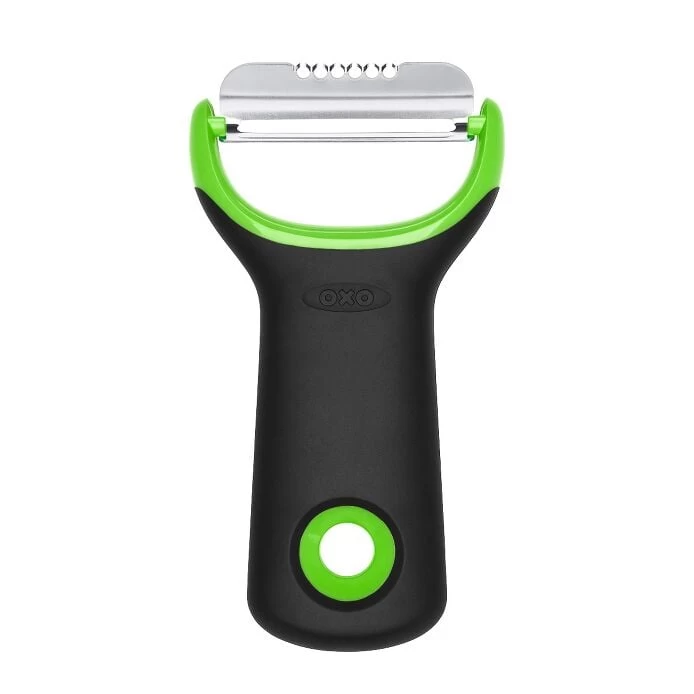 Leave the pith behind with the OXO Good Grips Citrus Prep Peeler & Zester. Create the perfect cocktail garnish, top of your favorite dessert with a little zest, and so much more. We took our iconic peeler and adapted it for this specific task, with a new compact design and easy-to-maneuver shape. The sharp, Japanese stainless steel blades will never rust, and the non-slip handle will keep you going until the job is done. Dishwasher safe.