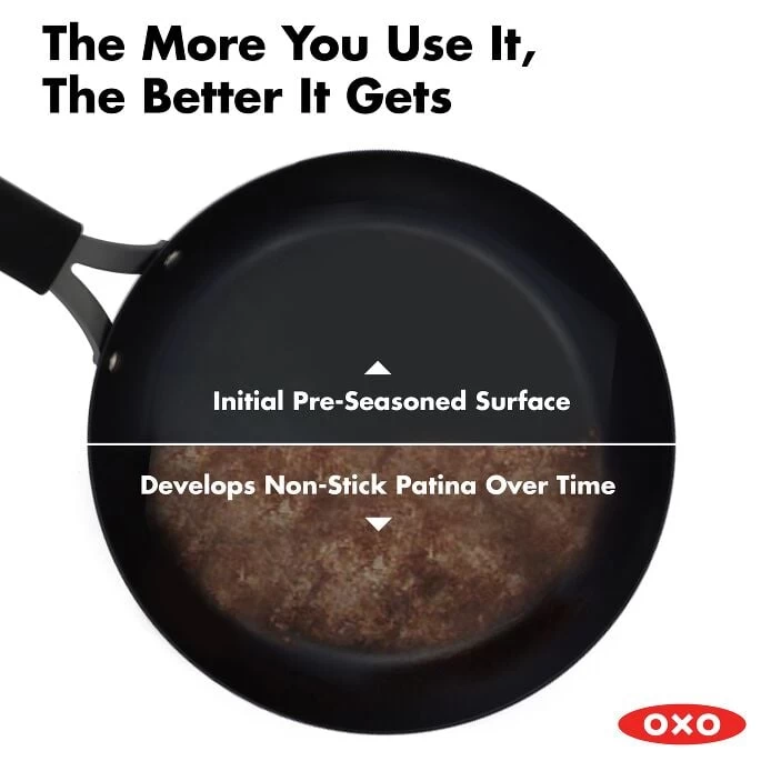 Lighter, easier and stronger—there’s a reason carbon steel is the choice of professional kitchens. Pre-seasoned to get you started, this OXO Obsidian Carbon Steel 8-in Frypan develops a naturally non-stick layer with use that’s ideal for frying delicate fish, cooking an omelet, or getting a perfect sear on pork chops. The more you use the pan, the better the non-stick patina layer will be. Precision engineered for powerful performance anywhere you need it, this pan travels effortlessly from stovetop to grill. This pan also comes with a removable silicone sleeve to keep cooking comfortable.
