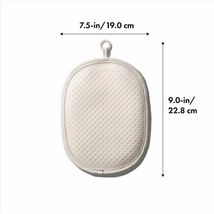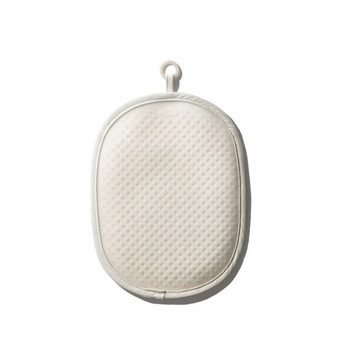 The OXO Good Grips Silicone Pot Holder protects your hand and other surfaces from extreme heat without sacrificing dexterity or grip. The Pot Holder features a flexible, non-slip diamond pattern that’s flame-, stain- and steam-resistant and designed to dissipate heat. Slip one hand into the comfortable, fabric-lined backside pocket for added control and insulation. The Pot Holder doubles as a trivet and includes a hanging loop for simple storage. Rinse clean, wipe down with a damp cloth, or machine wash.