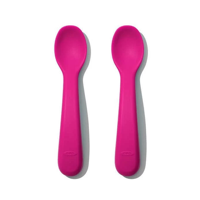 Tot Silicone Spoons are the ideal first utensil for babies and toddlers learning to feed themselves. Made with food-safe, BPA-free silicone, the soft spoon heads flex for comfort in tiny mouths — especially important for sensitive gums during teething. The deep head helps new eaters get more food onto the spoon and into their mouths for confidence-building success at mealtime. The rounded handle is easy for small hands to grip, while the anti-roll design means it stays put on the table.