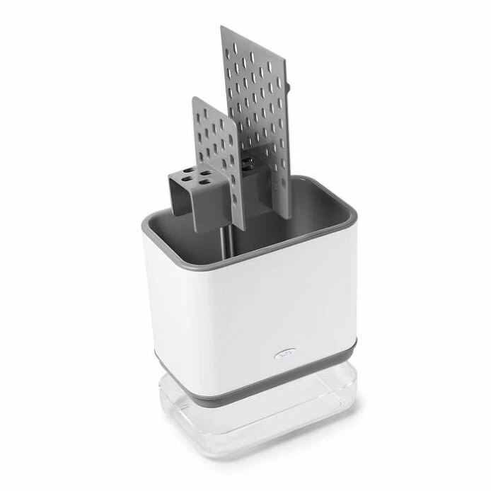 Tackle handwashing dishes once and for all with a Sinkware Caddy that does double duty. This crock-style organizer has two compartments designed for squeaky clean storage. The first compartment stores brushes and other cleaning tools upright for easy access; the second has an elevated sponge tray to keep two sponges dry and super handy. Both are perforated for airflow and to wick water away. Removable drip tray with a built-in spout comes apart for easy cleaning.