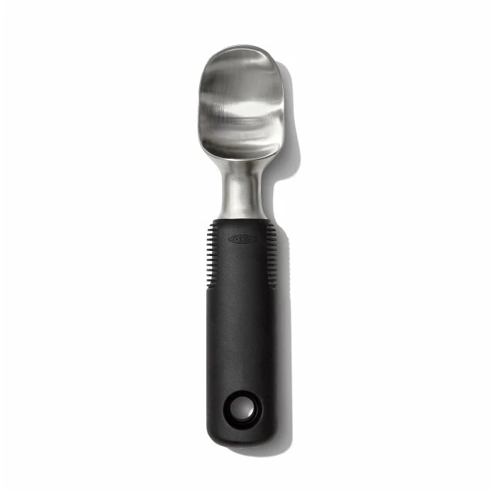 You know you’re not going to wait for ice cream to soften before you scoop it. So good news: The pointed shape and comfortable weight of the OXO Good Grips Solid Stainless Steel Ice Cream Scoop mean you can glide right through even hard ice cream. The flat edges let you scrape every last bit from the corners of your container. The non-slip grip is comfortable even when scooping dish after dish, and the stainless steel head won’t chip, pit or discolor. Dishwasher safe.