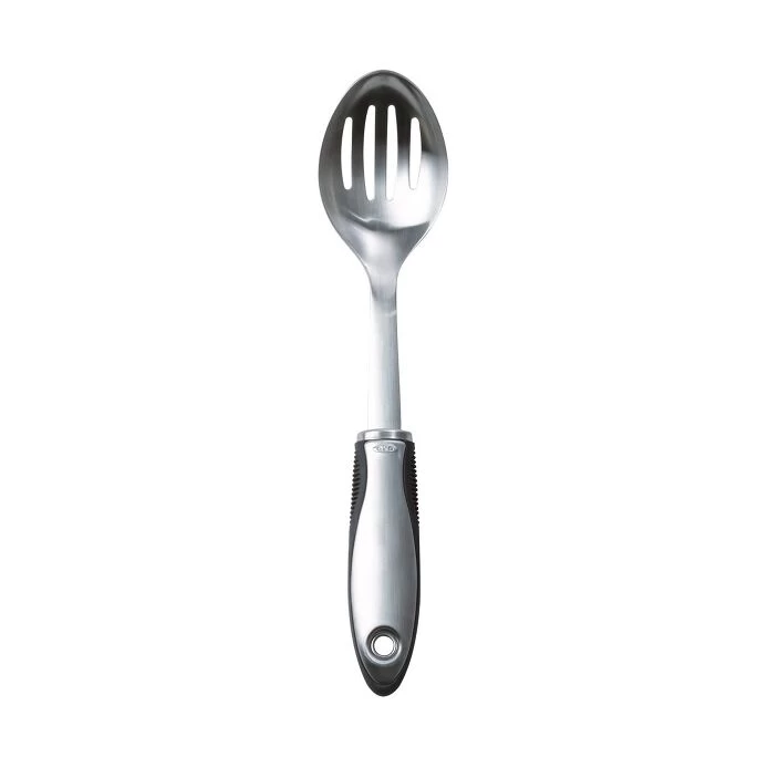 Sleek aesthetics and ergonomic design define the OXO SteeL line of kitchen and household tools. They feature brushed stainless steel handles for durability and flexible fins for ultimate comfort. The OXO SteeL Serving Slotted Spoon is perfect for stirring, straining and serving vegetables.