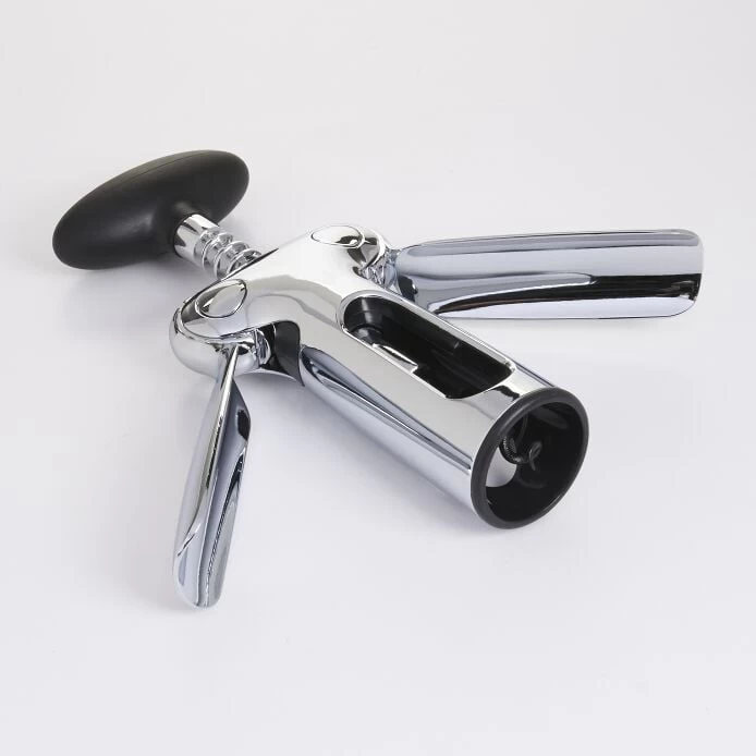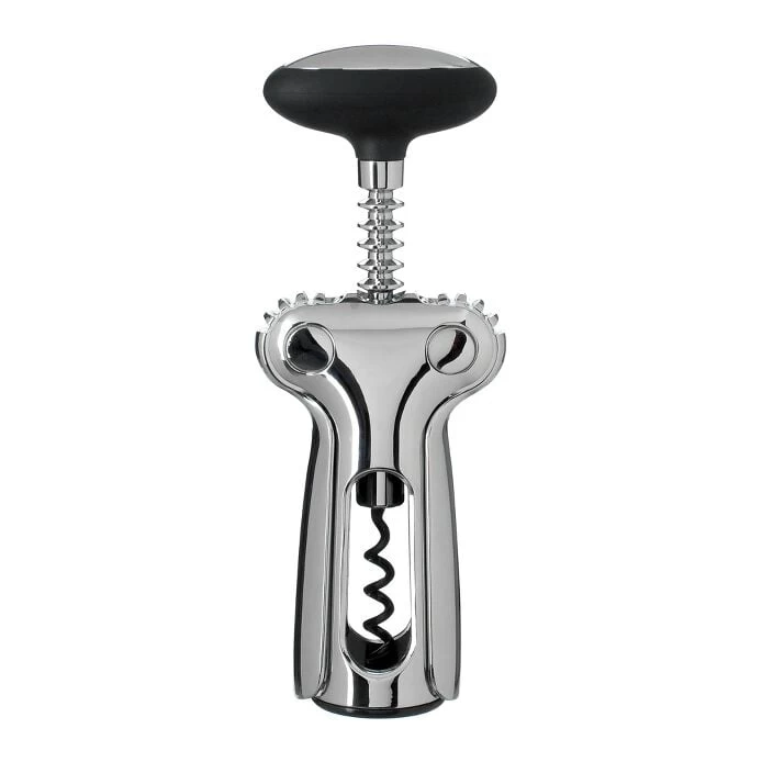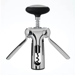 By turning the soft knob to thread the coated wire screw through a cork, the gear-driven wings rise up as the screw gets deeper into the cork. Simply push the wings down to release the cork. Feels substantial in the hand and looks elegant on the table.