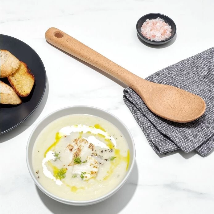 Our wooden utensils are made of solid, one-piece beech wood, and designed for comfort and utility. Their distinctive straight-sided shape allows better reach along walls and in corners of cookware. A natural oil finish coats and protects the wood. Safe for non-stick cookware. Hand wash only.